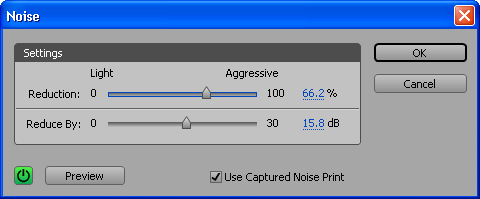 At this point we should mention the Use Captured Noise Print checkbox. Obviously this is what we have done, but you can also deselect this option and let Soundbooth decide what audio to remove. This can be surprisingly effective so give it a try.