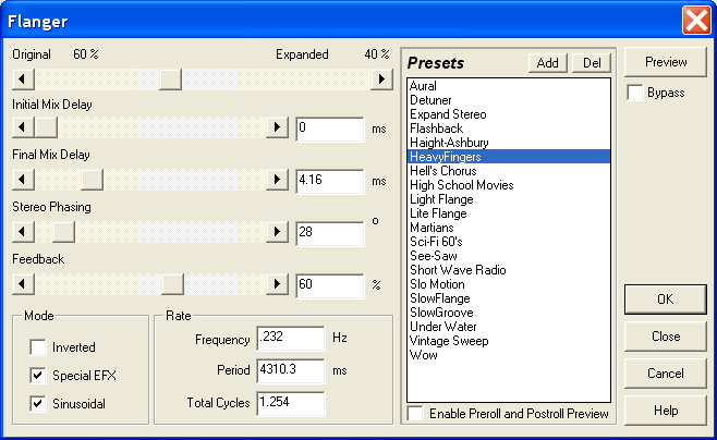 The following example is the flanger settings window in Adobe Audition. It shows some of the settings commonly used in flanging: